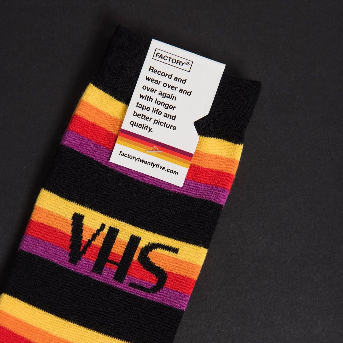 Socks for the cinephile and lover of physical media. The stripes harken back to old VHS tape packaging. Never forget to be kind and rewind...