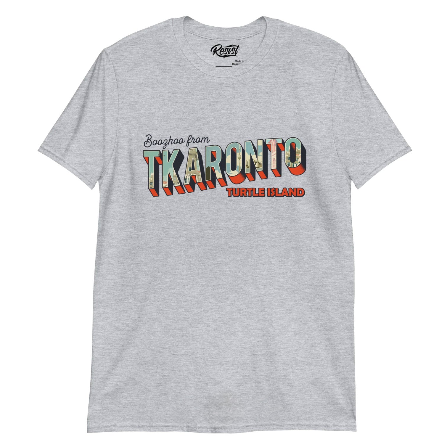 This TKARONTO T-Shirt incorporates the Ojibwe greeting, "Boozhoo" and "Turtle Island", the name for the lands now known as North and Central America.