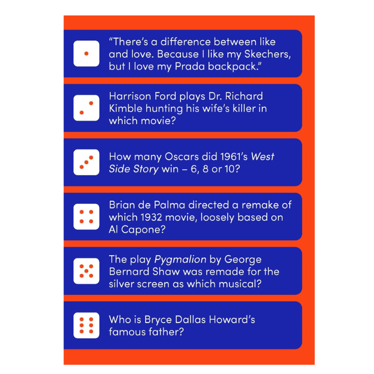 If you think you know everything about movies, Film Buff will put you to the test with over 1000 questions that will make even the most devoted cinephile sweat. Divided into six categories and complete with two die, this game will put your knowledge to the test about Quotes, Actors, Awards Winners and Losers, Directors and Film Makers, Behind the Scenes Facts, and Connections. Pop some corn, roll the dice to pick a category, and get your game night rolling.