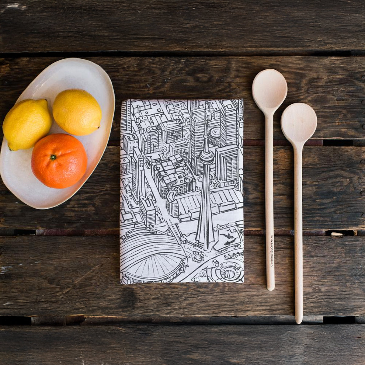 Dry your dishes in style with this exquisite cotton tea towel featuring Toronto's downtown core. Illustrations of City Hall, the CN Tower, the Financial District, or our famous waterfront will transport you away from your washing up!