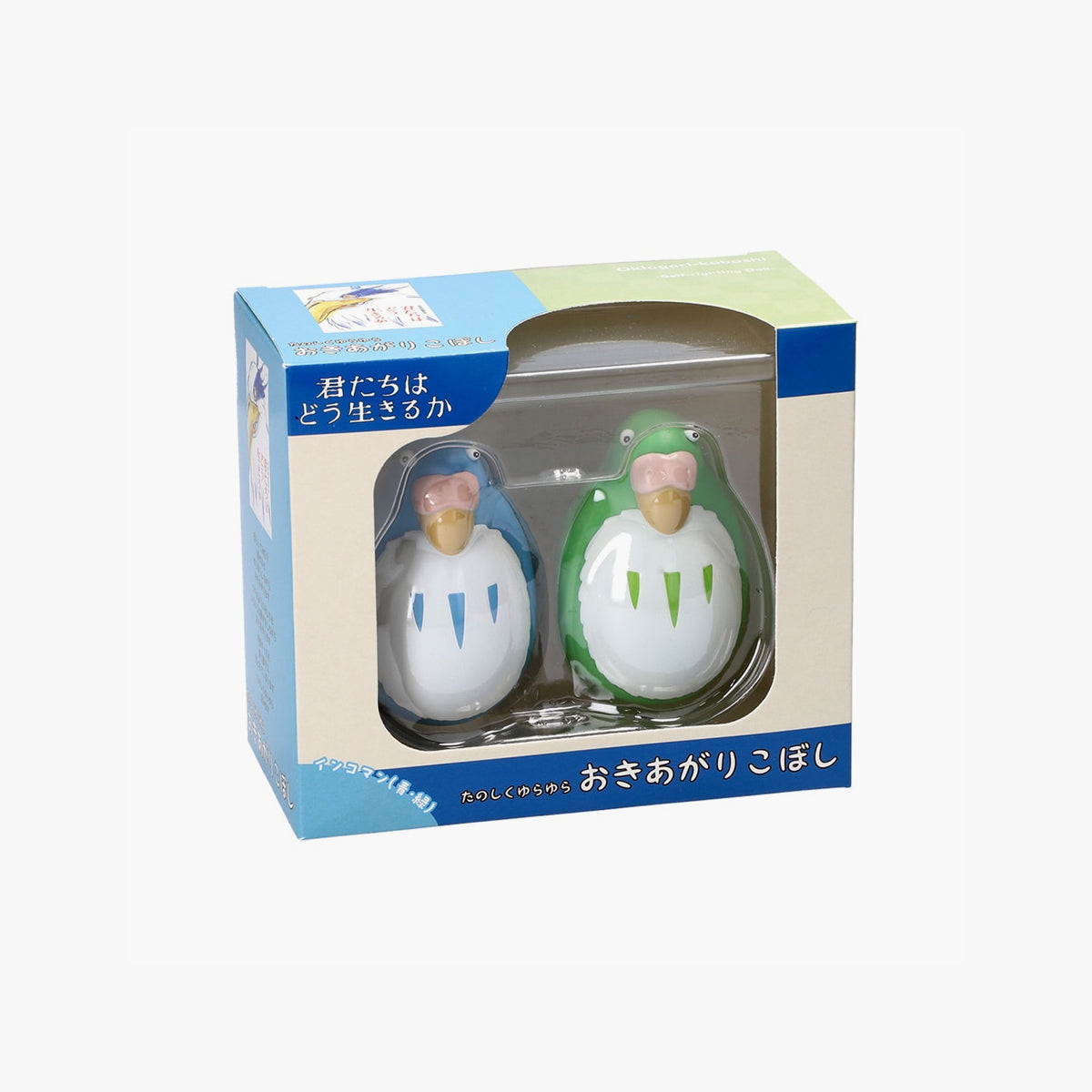 A set of two tilting figures featuring the blue and green Parakeets from The Boy and The Heron. Watch these wibble and wobble, tilt left and right but never fall! Entertaining toys that make great decorations.