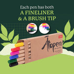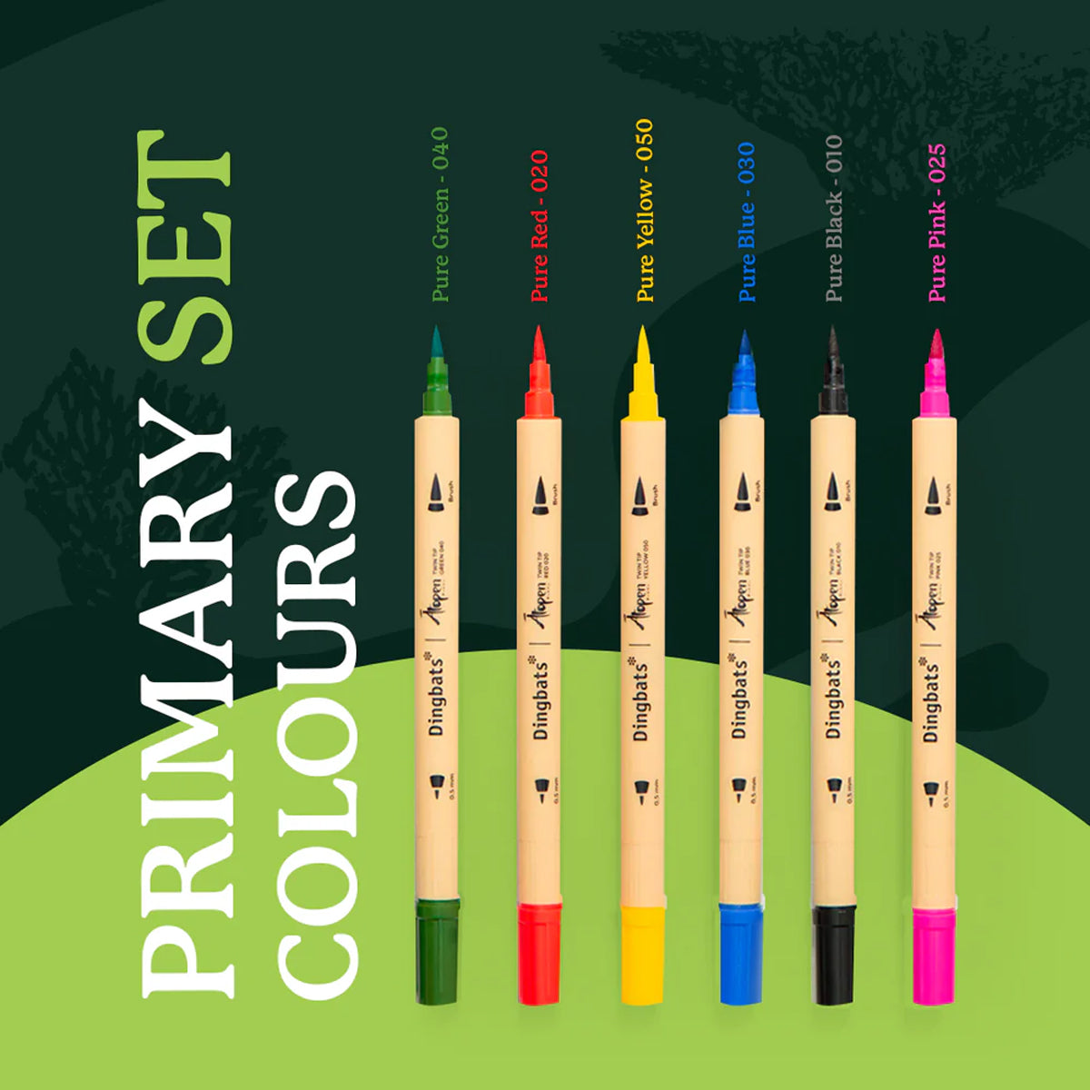 Along with having a fineliner tip and a brush tip, the six colours offered are: Pure Yellow - 050, Pure Red - 020, Pure Pink - 025, Pure Blue - 030, Pure Green - 040, Pure Black - 010. This pack is ideal for calligraphy, art, colouring, fine art, illustrations, doodling, and journaling.