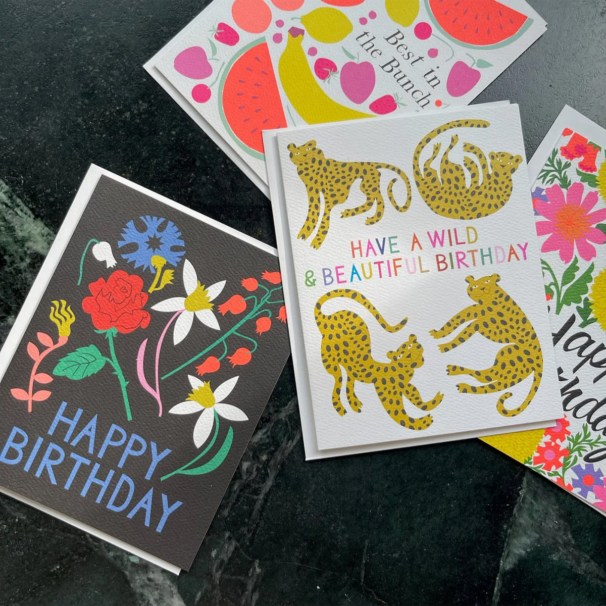 Frolicking cheetahs and a multi-coloured wild and beautiful birthday greeting.